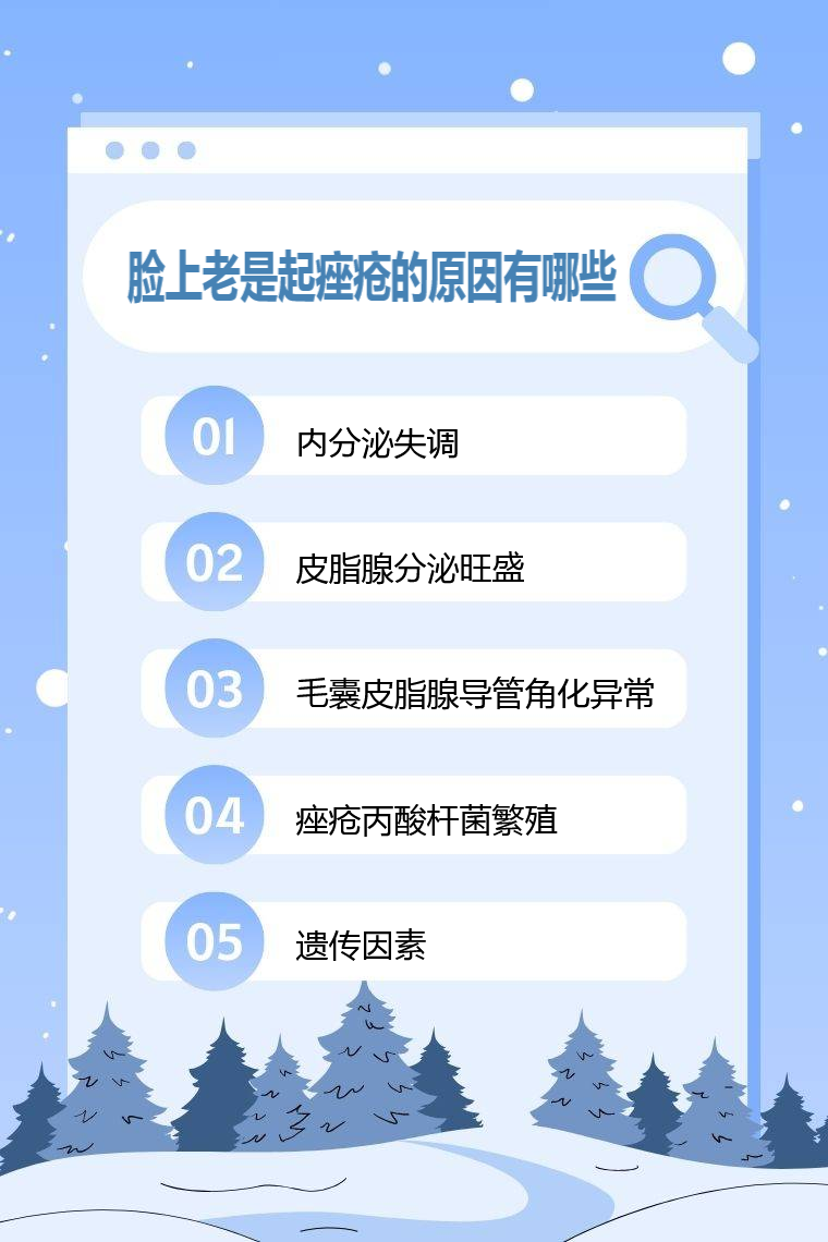 脸上老是起痤疮的原因有内分泌失调、皮脂腺分泌旺盛、毛囊皮脂腺导管角化异常、痤疮丙酸杆菌繁殖、遗传因素等。
