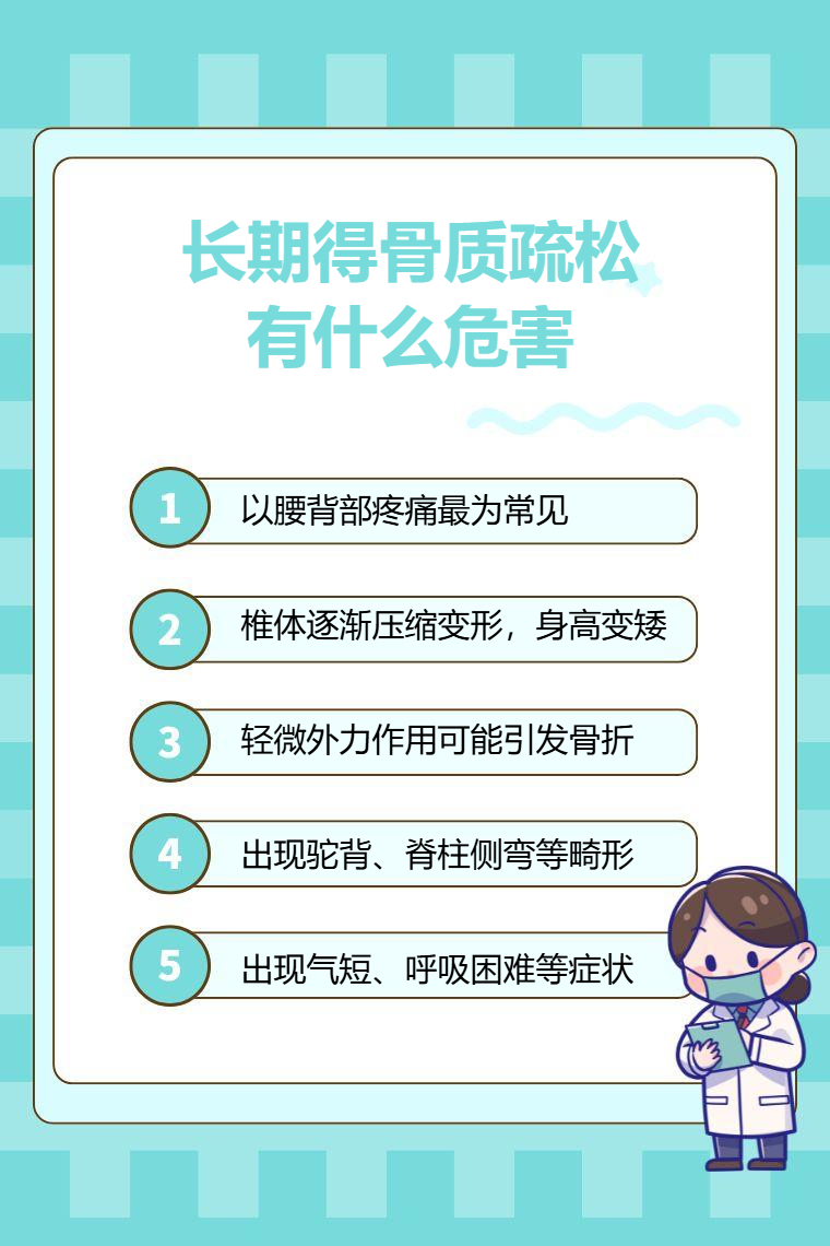 长期得骨质疏松会导致疼痛、身高变矮、骨折、脊柱变形、呼吸功能下降等。