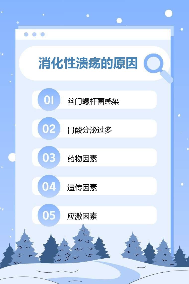 消化性溃疡的原因主要有幽门螺杆菌感染、胃酸分泌过多、药物因素、遗传因素、应激因素等。
