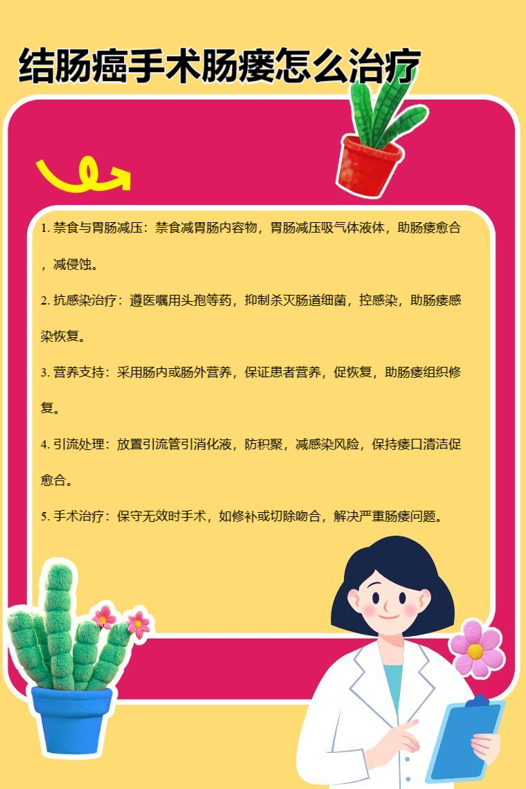 结肠癌手术肠瘘的治疗方法有禁食与胃肠减压、抗感染治疗、营养支持、引流处理、手术治疗等。