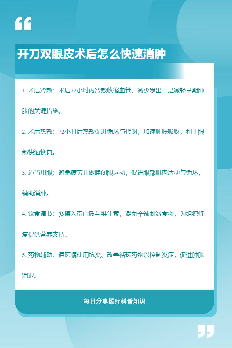 开刀双眼皮术后可通过冷敷、热敷、适当用眼、饮食调节、药物辅助等快速消肿。