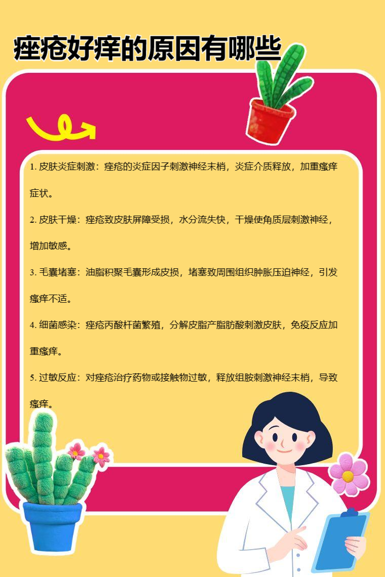 痤疮好痒的原因有皮肤炎症刺激、皮肤干燥、毛囊堵塞、细菌感染、过敏反应等。