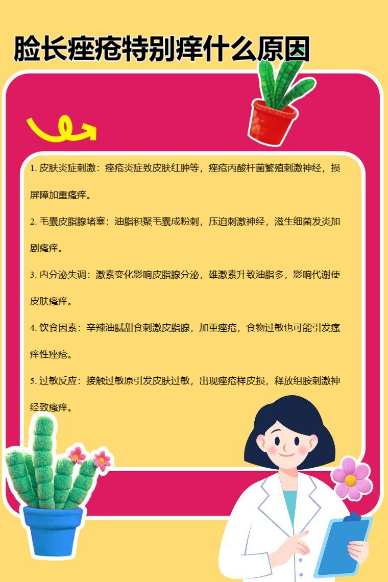 脸长痤疮特别痒的原因有皮肤炎症刺激、毛囊皮脂腺堵塞、内分泌失调、饮食因素、过敏反应等。