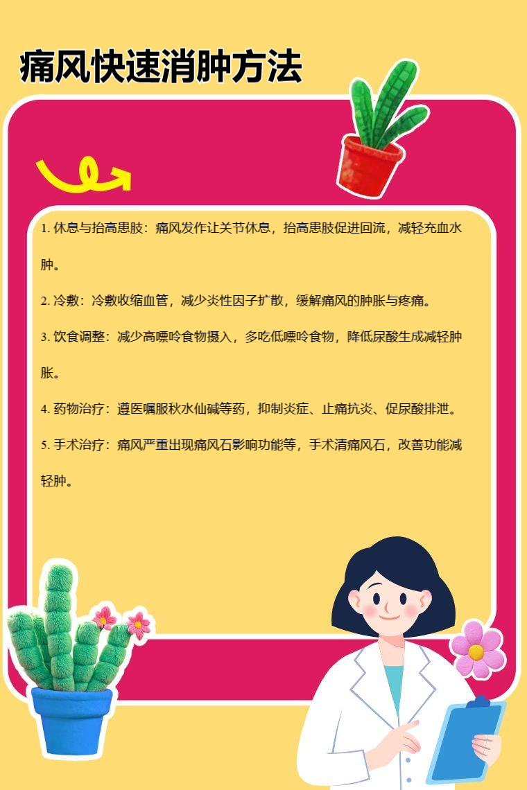 痛风快速消肿可通过休息与抬高患肢、冷敷、饮食调整、药物治疗、手术治疗等。