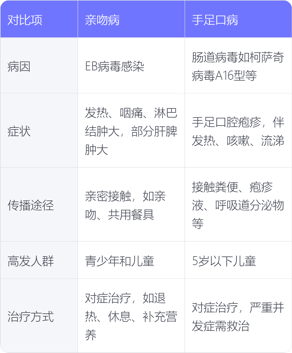 亲吻病和手足口病在病因、症状、传播途径、高发人群、治疗方式上存在不同。