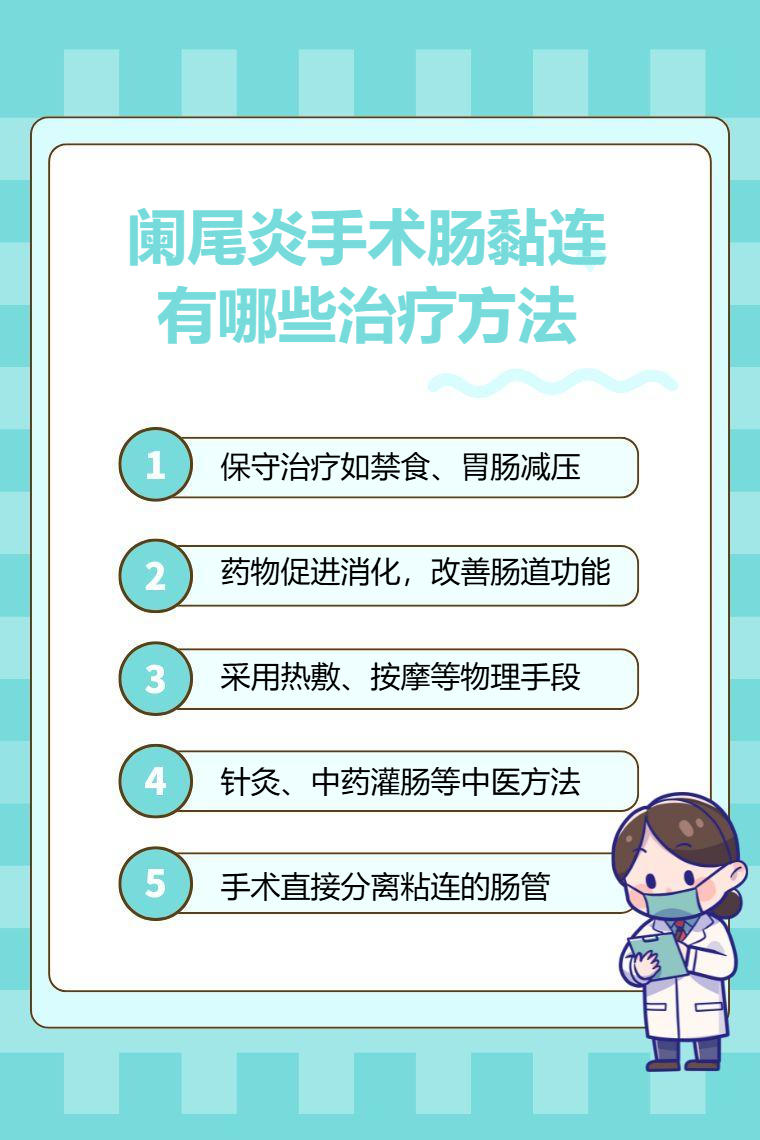 阑尾炎手术后肠粘连的治疗方法有保守治疗、药物治疗、物理治疗、中医治疗、手术治疗等。