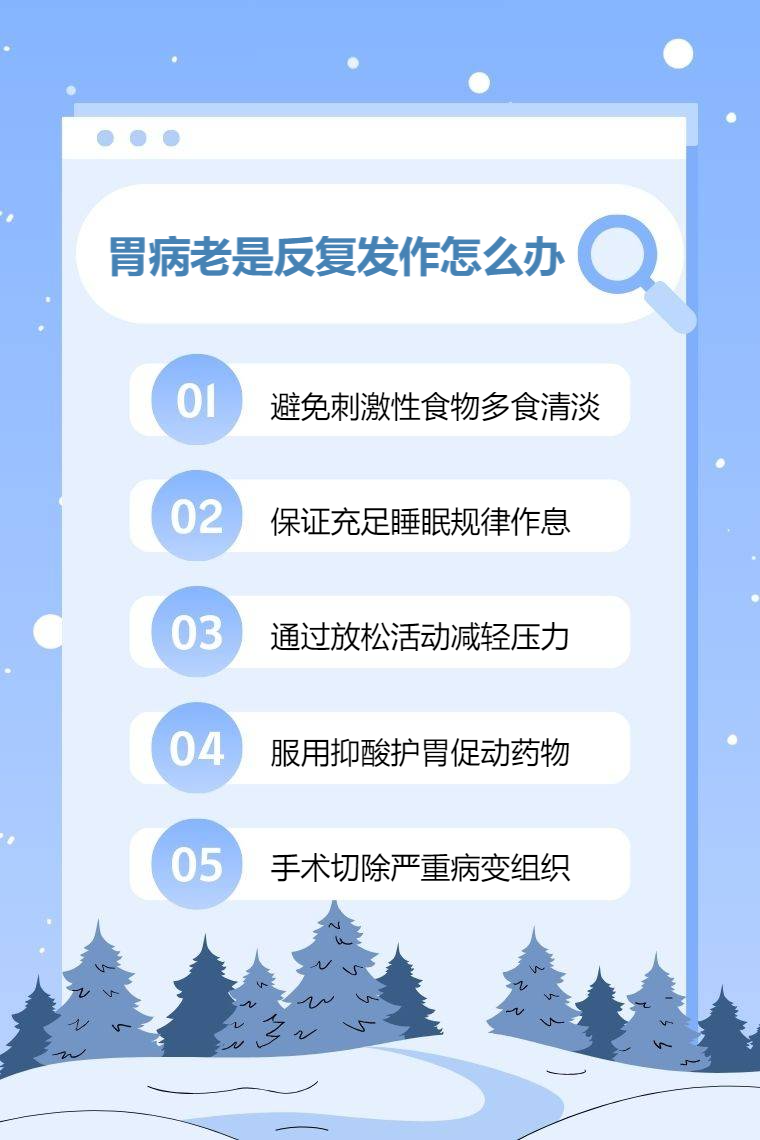 胃病老是反复发作可通过调整饮食、规律作息、心理调节、药物治疗、手术治疗等方法应对。