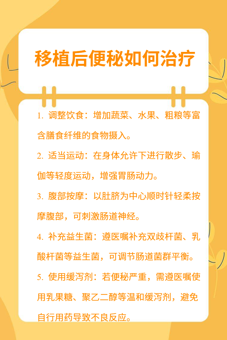 移植后出现便秘情况,除采用上述方法治疗外,日常还应养成良好排便习惯,定时排便,避免憋便。同时保持心情舒畅,避免精神紧张焦虑,因为不良情绪也可能影响肠道功能加重便秘。若便秘持续不缓解或伴有其他不适,需及时就医。