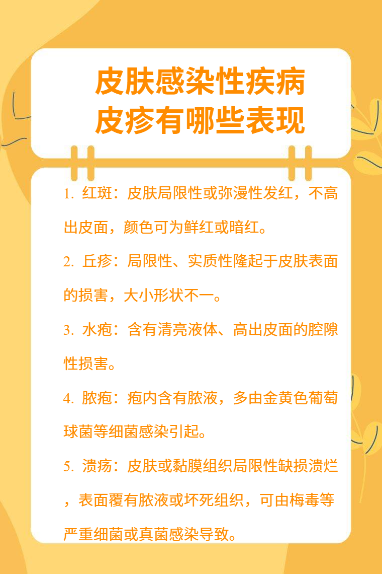 皮肤感染性疾病皮疹表现多样,常见的有红斑、丘疹、水疱、脓疱、溃疡等。