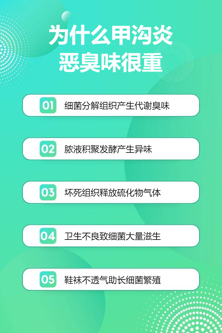 2. 脓液积聚:炎症刺激会导致甲沟处产生大量脓液,脓液中包含死亡的白细胞、细菌及组织渗出液等。这些物质长时间积聚在甲沟狭小空间内,无法及时排出,就会发酵产生恶臭味。