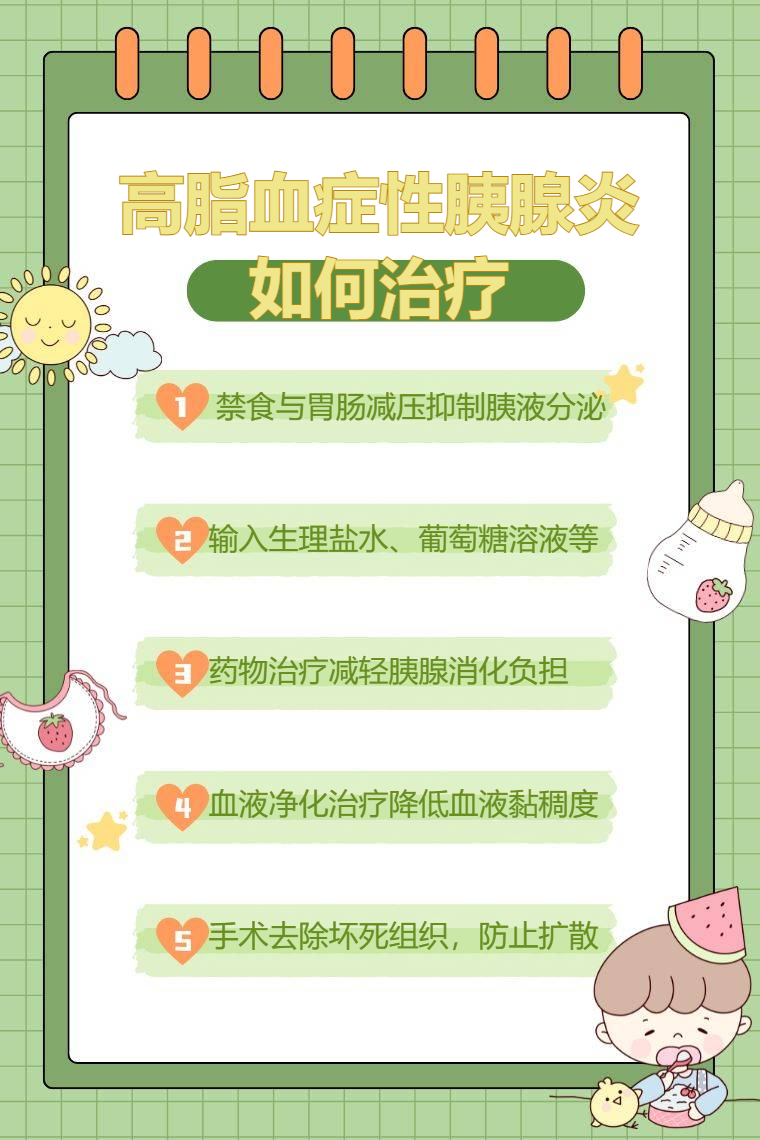 高脂血症性胰腺炎的治疗方法主要有禁食与胃肠减压、补液治疗、药物治疗、血液净化治疗、手术治疗等。