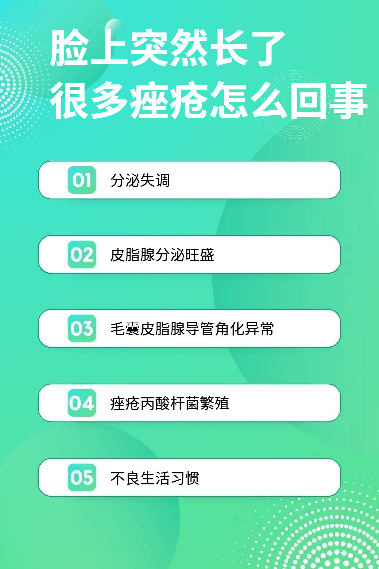 脸上突然长很多痤疮,常见原因有内分泌失调、皮脂腺分泌旺盛、毛囊皮脂腺导管角化异常、痤疮丙酸杆菌繁殖、不良生活习惯等。