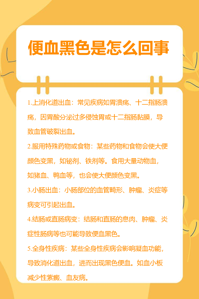 5.全身性疾病:某些全身性疾病会影响凝血功能,导致消化道出血,进而出现黑色便血。如血小板减少性紫癜,患者体内血小板数量减少,凝血功能下降,容易出现皮肤、黏膜及胃肠道等部位的出血;血友病患者体内缺乏某些凝血因子,也会导致凝血障碍,引起消化道出血。