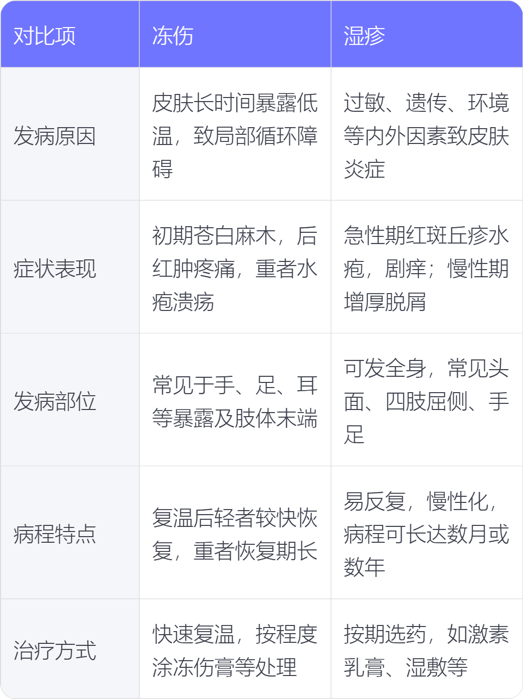 1. 发病原因:冻伤是因皮肤长时间暴露于低温环境,导致局部血液循环障碍引发;湿疹则多由多种内外因素共同作用,如过敏、遗传、环境变化、精神因素等诱发皮肤炎症反应。