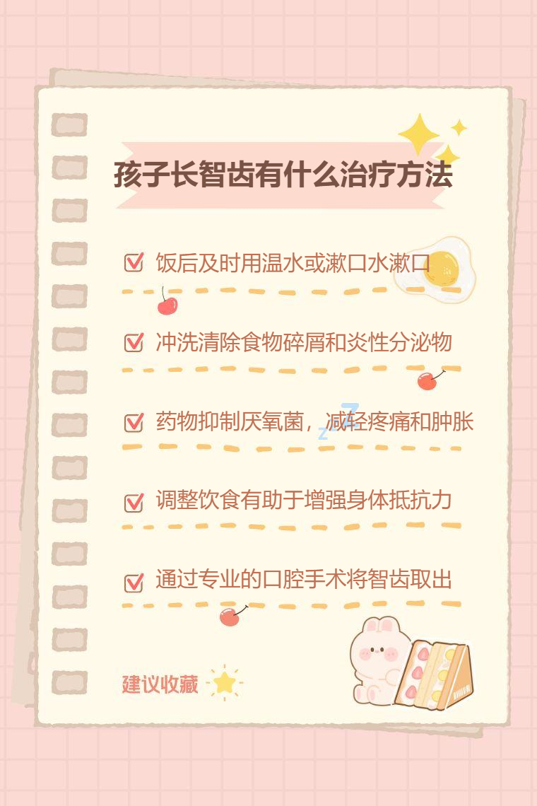 孩子长智齿的治疗方法有保持口腔清洁、局部冲洗、药物治疗、调整饮食、手术拔除等。