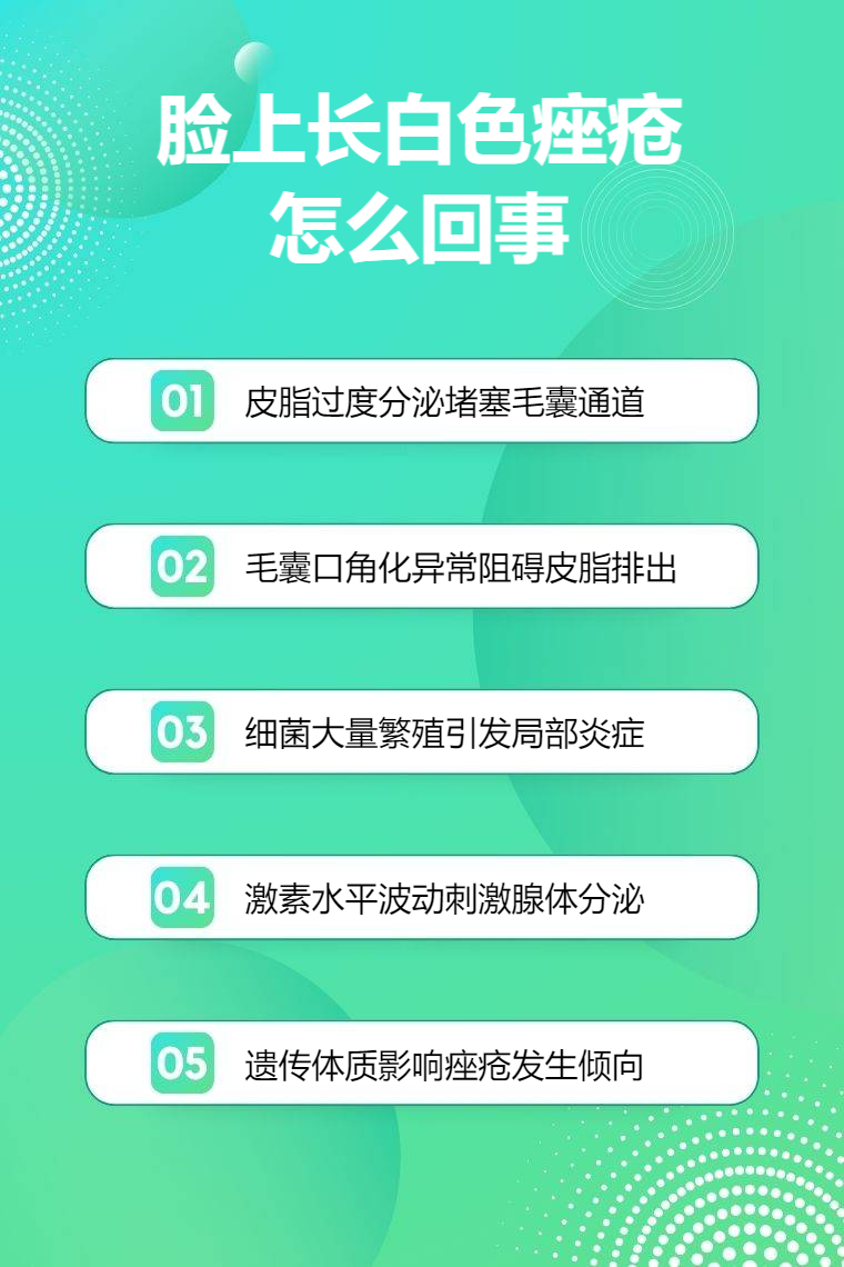 脸上长白色痤疮通常与皮脂腺分泌旺盛、毛囊口角化异常、痤疮丙酸杆菌繁殖、内分泌失调、遗传因素等有关。
