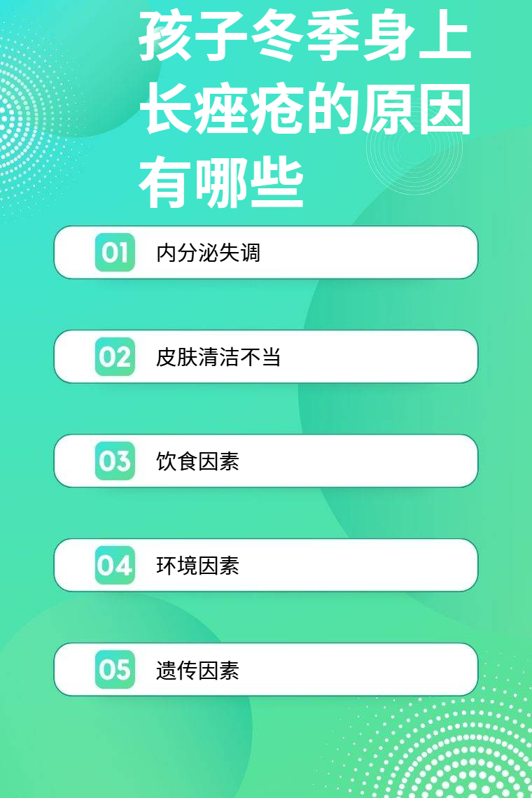 1. 内分泌失调:冬季时,孩子的内分泌系统可能会因季节变化等因素出现紊乱。比如,激素水平失衡,雄激素分泌相对增多,会促使皮脂腺分泌更多油脂,当油脂无法及时排出,就容易堵塞毛孔,进而引发痤疮。