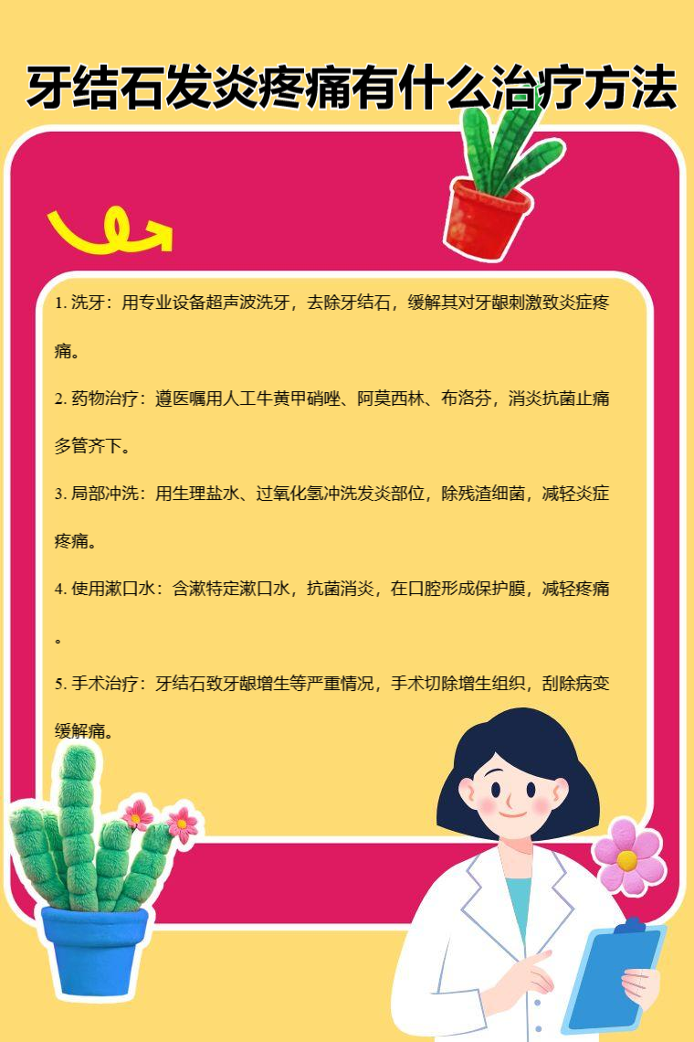 牙结石发炎疼痛可通过洗牙、药物治疗、局部冲洗、使用漱口水、手术治疗等方法缓解。