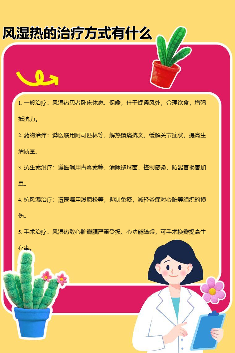 风湿热的治疗方式主要有一般治疗、药物治疗、抗生素治疗、抗风湿治疗、手术治疗等。
