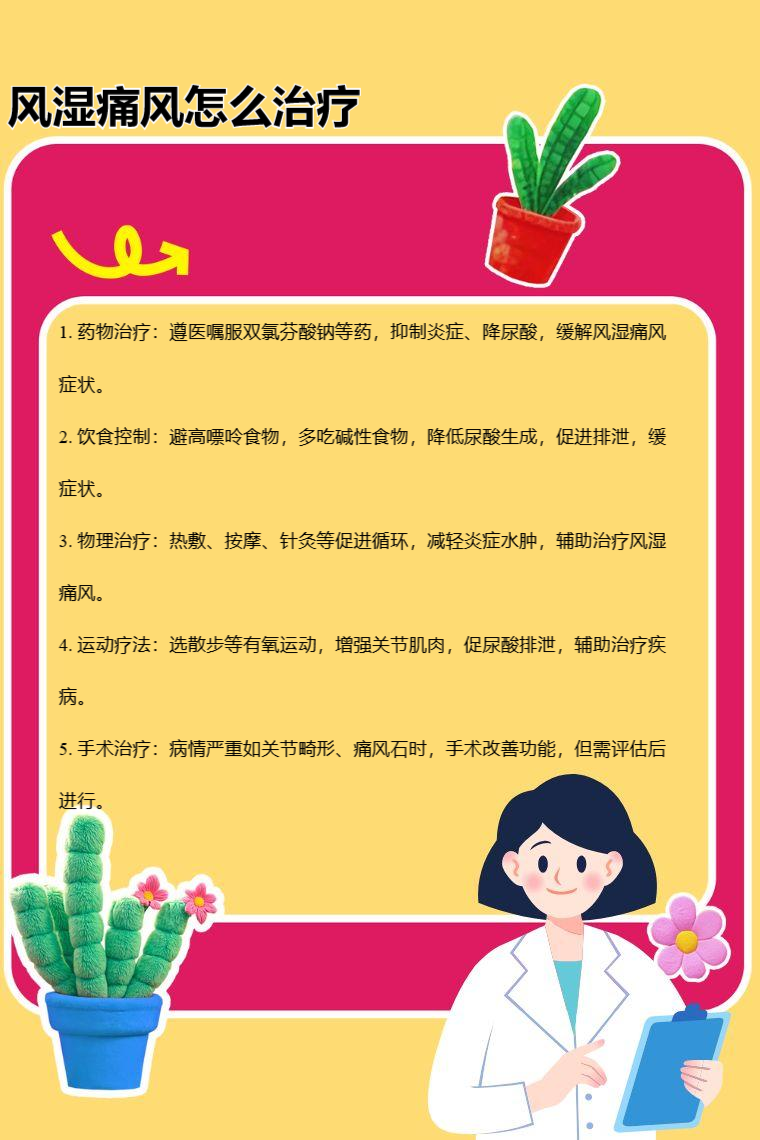 风湿痛风的治疗方法主要有药物治疗、饮食控制、物理治疗、运动疗法、手术治疗等。