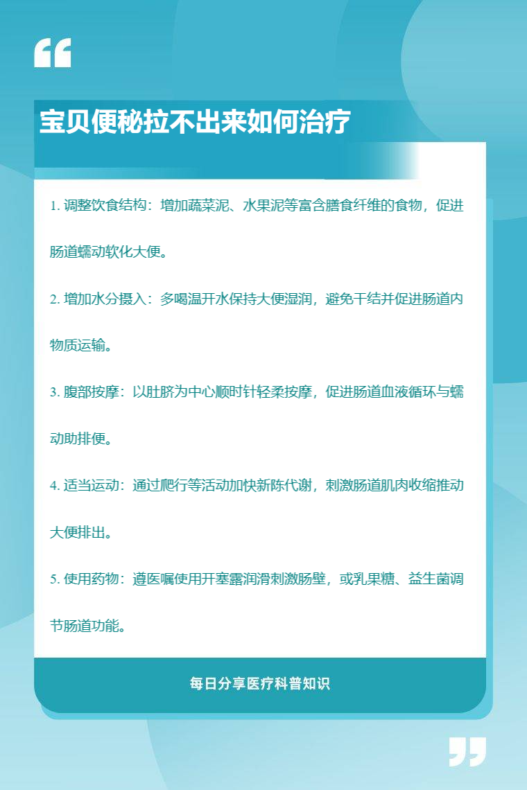 宝贝便秘拉不出来可通过调整饮食结构、增加水分摄入、腹部按摩、适当运动、使用药物等方法治疗。