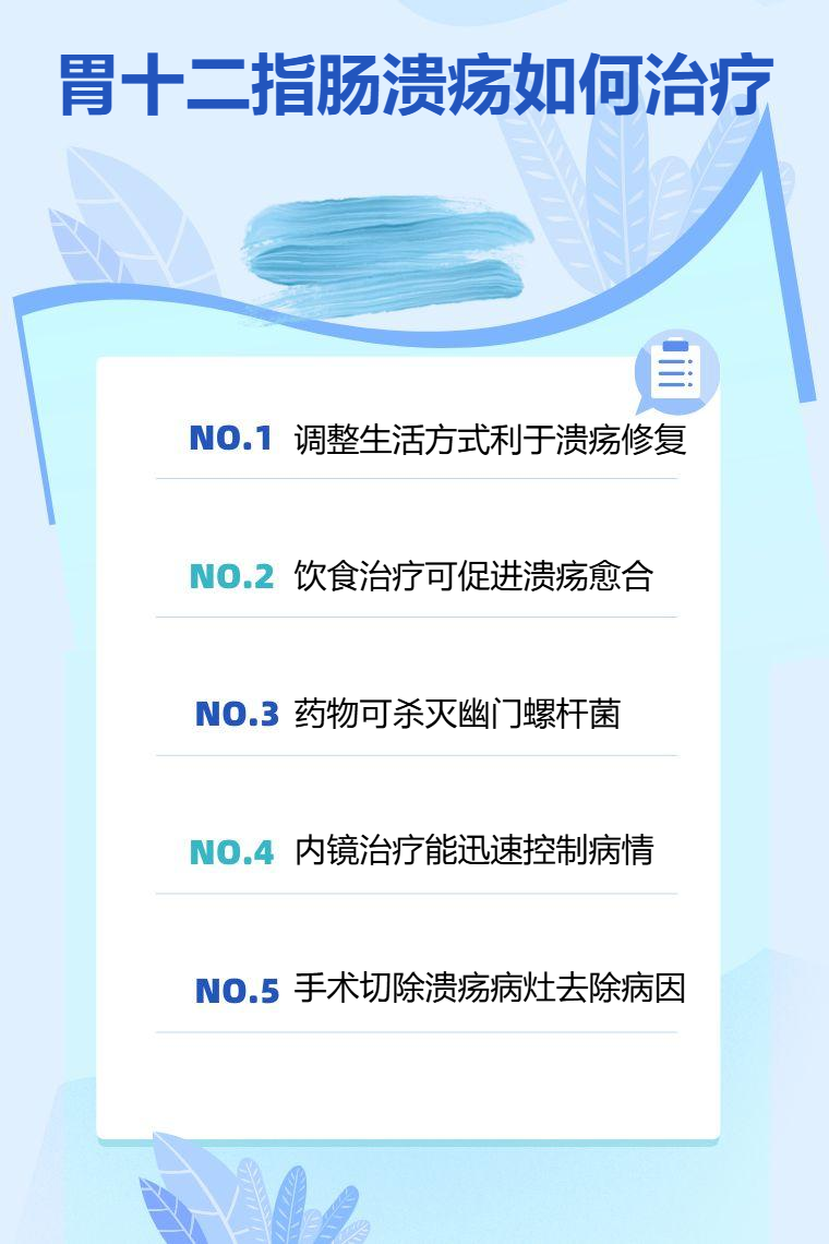 胃十二指肠溃疡的治疗方法主要有调整生活方式、饮食治疗、药物治疗、内镜治疗、手术治疗等。