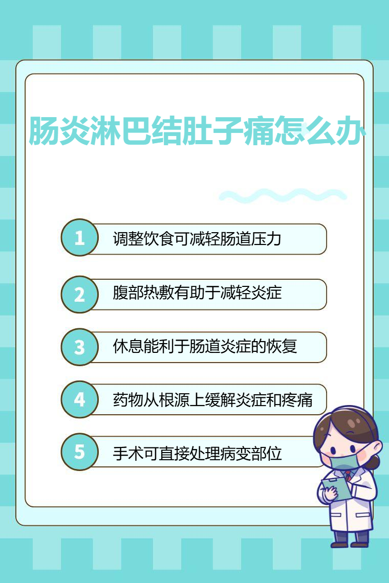 肠炎淋巴结肚子痛可通过调整饮食、腹部热敷、适当休息、药物治疗、手术治疗等方法缓解。