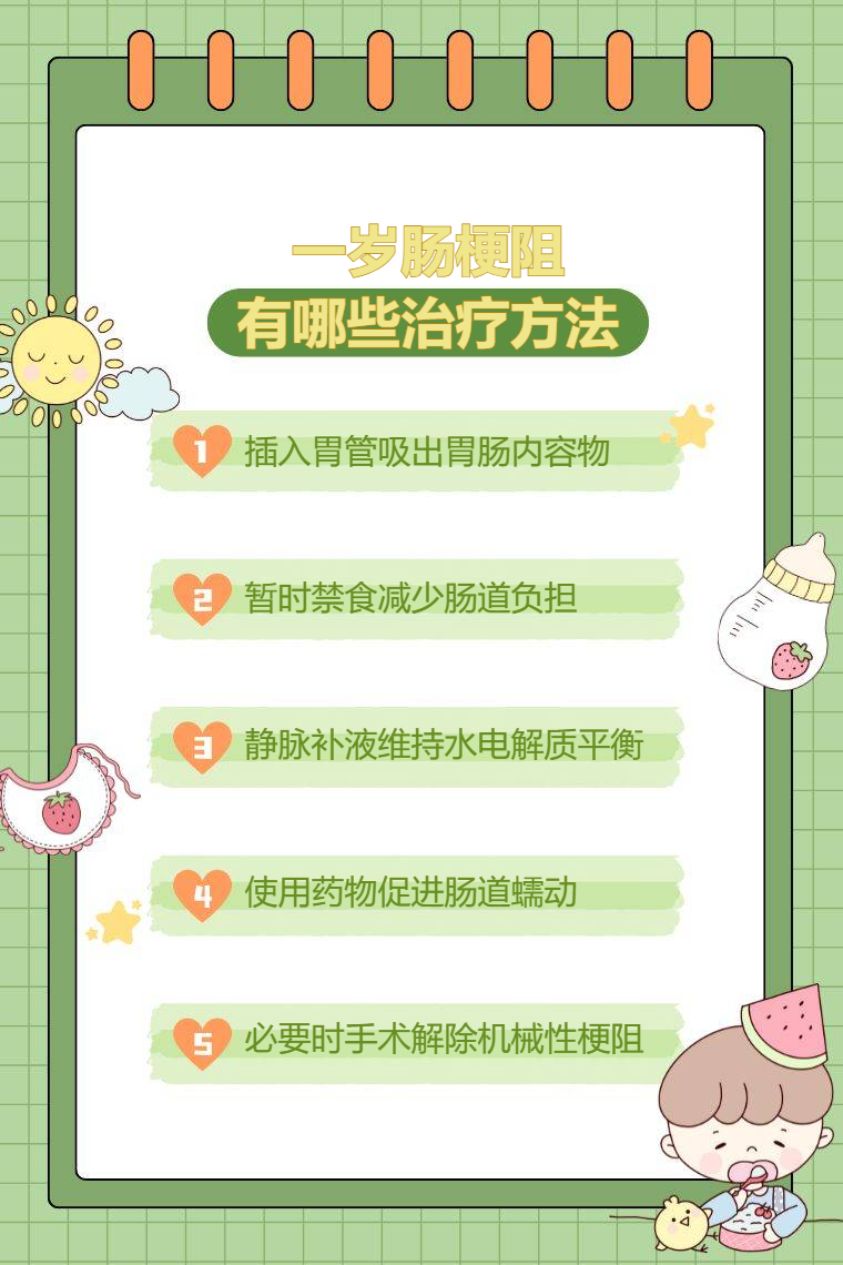 一岁肠梗阻的治疗方法有胃肠减压、禁食禁水、补液治疗、药物治疗、手术治疗等。