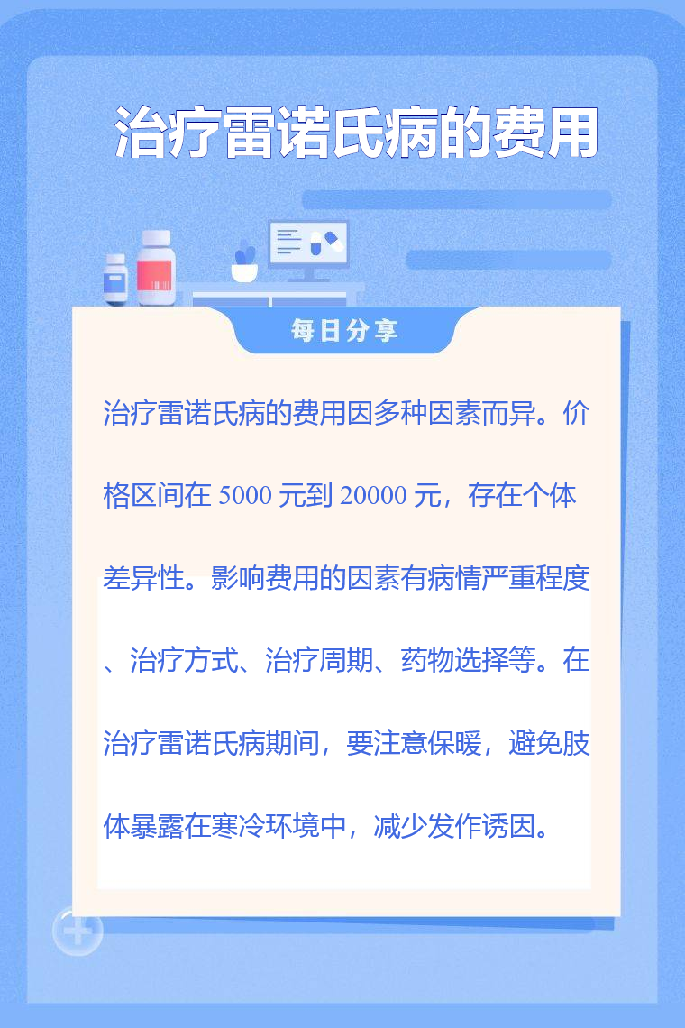 治疗雷诺氏病的费用因多种因素而异。价格区间在 5000 元到 20000 元,存在个体差异性。影响费用的因素有病情严重程度、治疗方式、治疗周期、药物选择等。