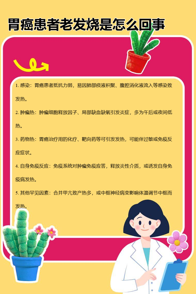 胃癌患者老发烧可能是由于感染、肿瘤热、药物热、自身免疫反应、其他罕见因素等。