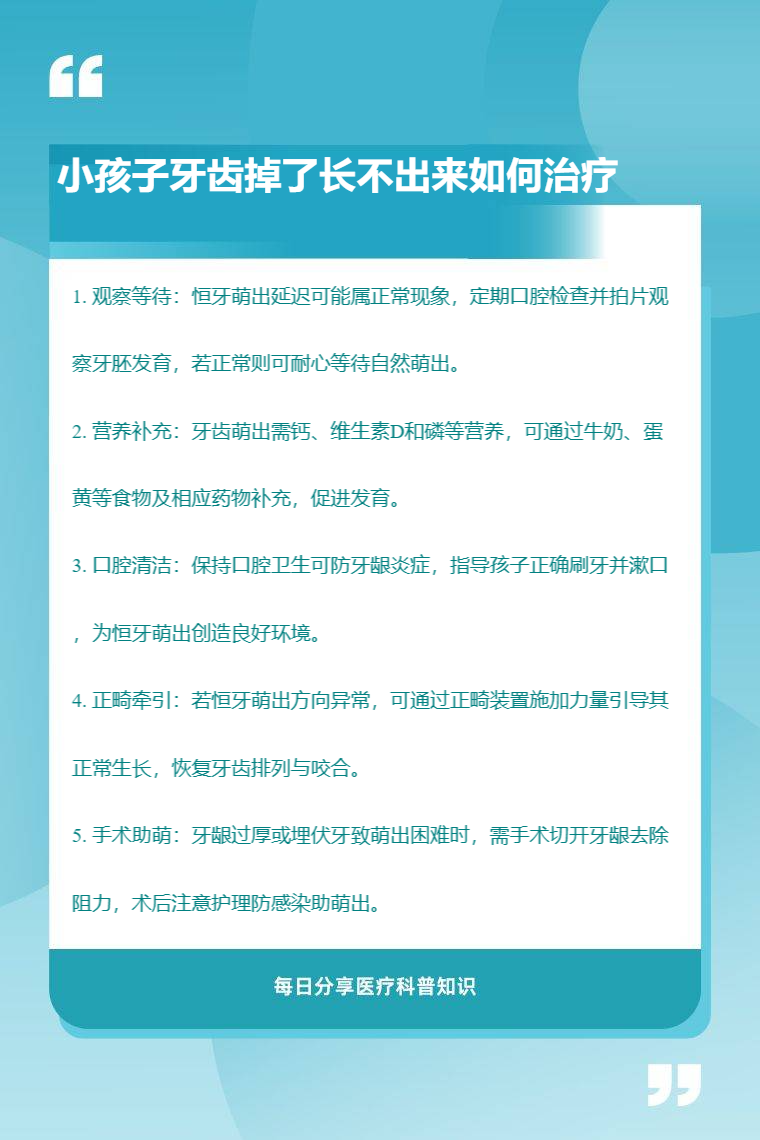 小孩子牙齿掉了长不出来可通过观察等待、营养补充、口腔清洁、正畸牵引、手术助萌等方法治疗。