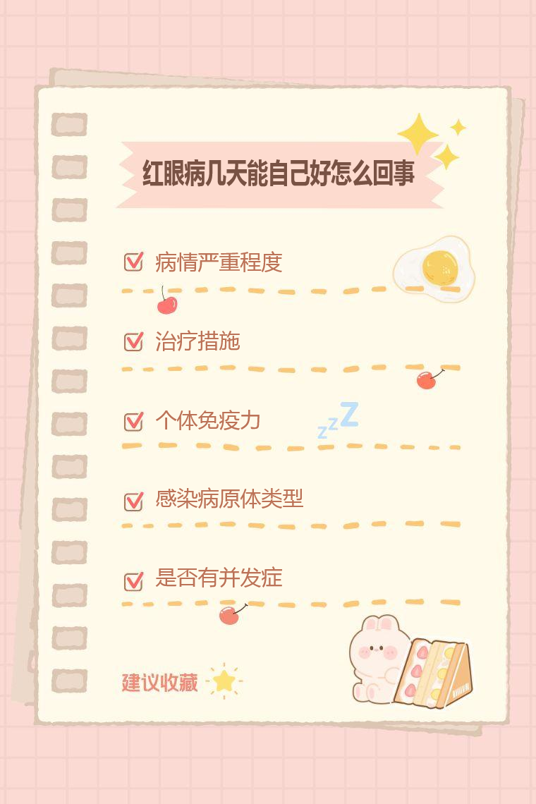 红眼病通常一周左右能自己好,不过具体恢复时间受病情严重程度、治疗措施、个体免疫力、感染病原体类型、是否有并发症等影响。