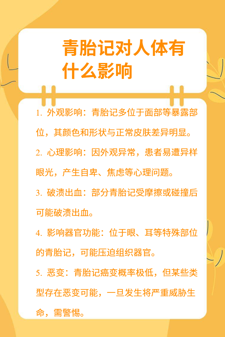 青胎记对人体的影响包括外观影响、心理影响、破溃出血、影响器官功能、恶变等。