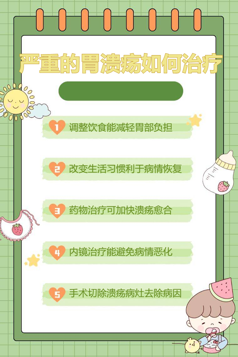 严重的胃溃疡可通过调整饮食、改变生活习惯、药物治疗、内镜治疗、手术治疗等方法进行治疗。
