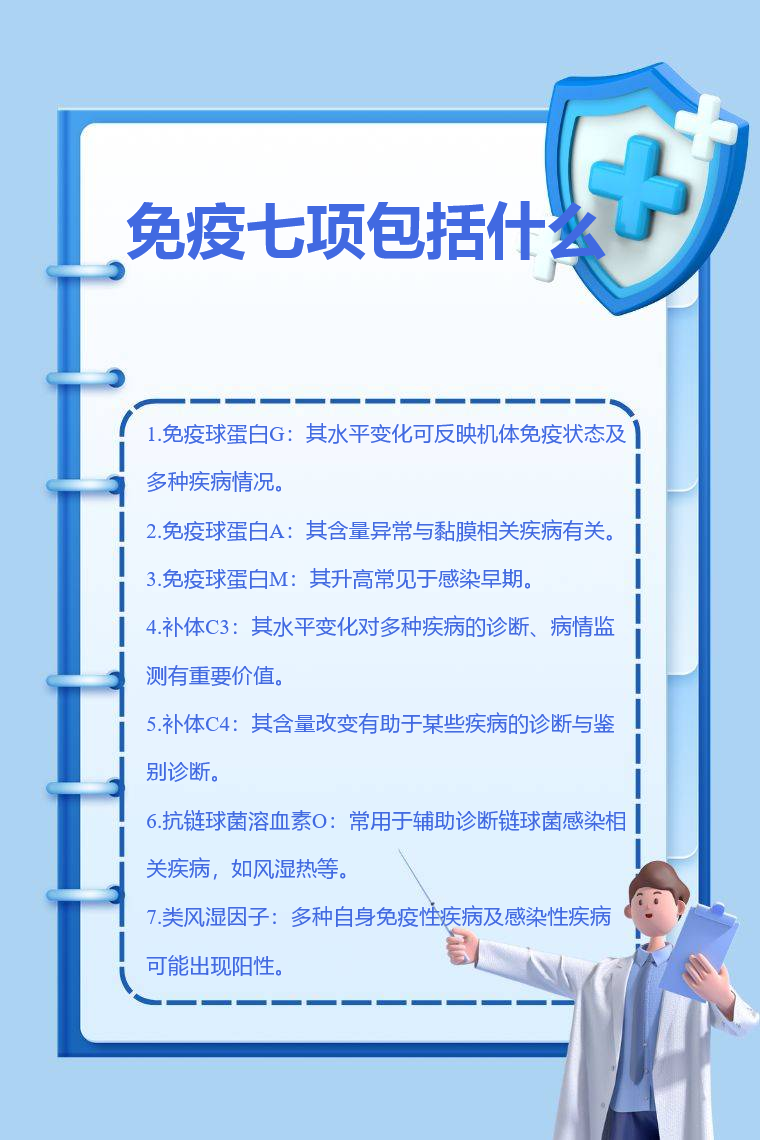 免疫七项包括免疫球蛋白G、免疫球蛋白A、免疫球蛋白M、补体C3、补体C4、抗链球菌溶血素O、类风湿因子等。