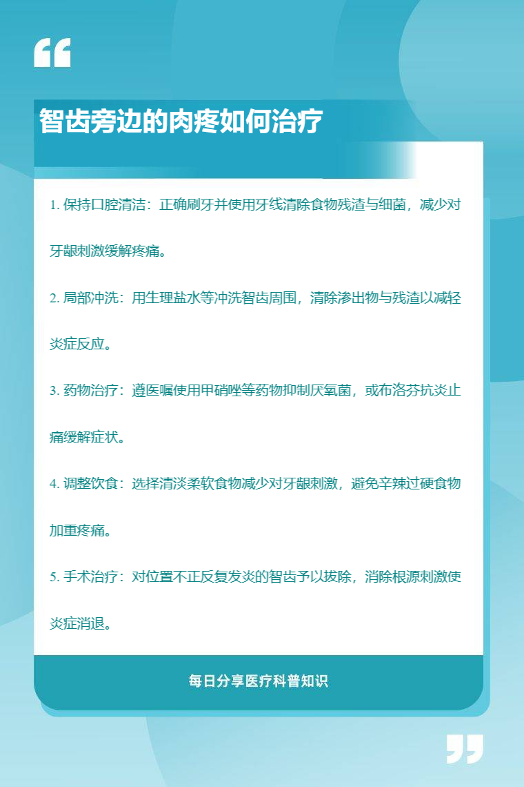 智齿旁边的肉疼可通过保持口腔清洁、局部冲洗、药物治疗、调整饮食、手术治疗等方法来缓解。