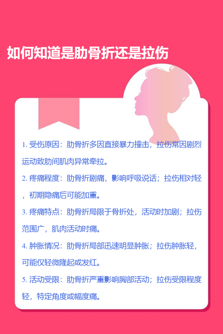 判断是肋骨折还是拉伤可从受伤原因、疼痛程度、疼痛特点、肿胀情况、活动受限等方面入手。