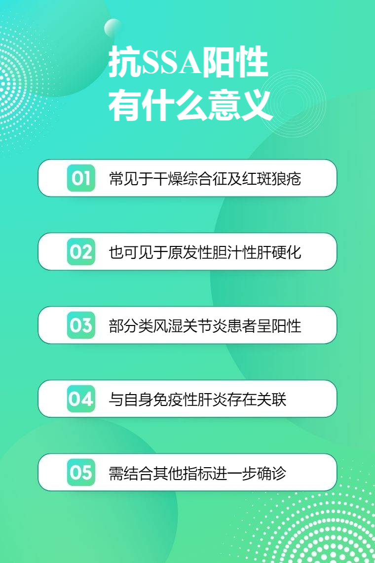 抗 SSA 阳性常见于干燥综合征、系统性红斑狼疮,还可见于原发性胆汁性肝硬化、类风湿关节炎、自身免疫性肝炎等。