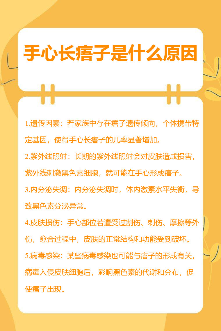 2.紫外线照射:长期的紫外线照射会对皮肤造成损害,手部皮肤长时间暴露在外,紫外线刺激黑色素细胞,使其功能活跃,产生过多黑色素,这些黑色素逐渐堆积,就可能在手心形成痦子,日常防晒不到位会加剧这种情况 。