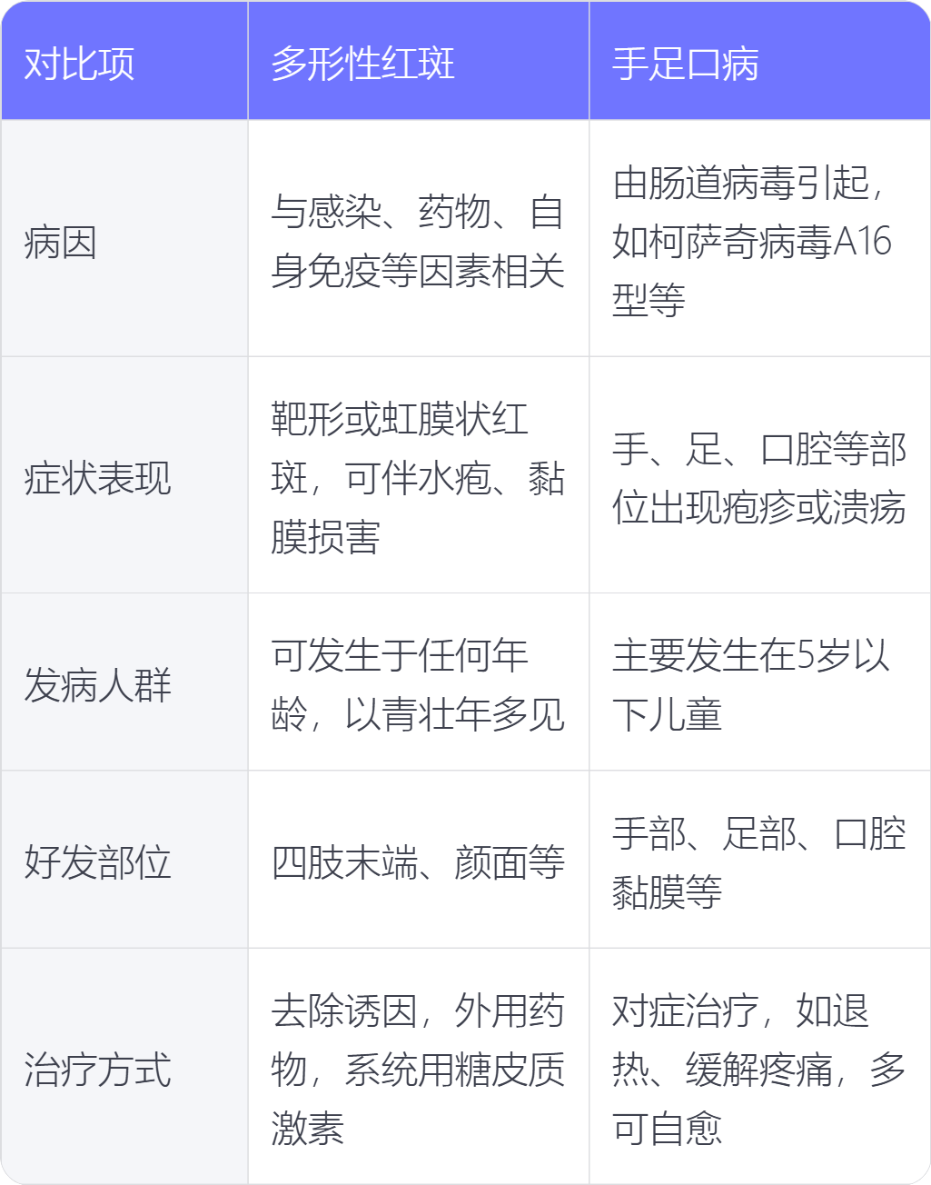 多形性红斑和手足口病在病因、症状表现、发病人群、好发部位、治疗方式上存在不同。