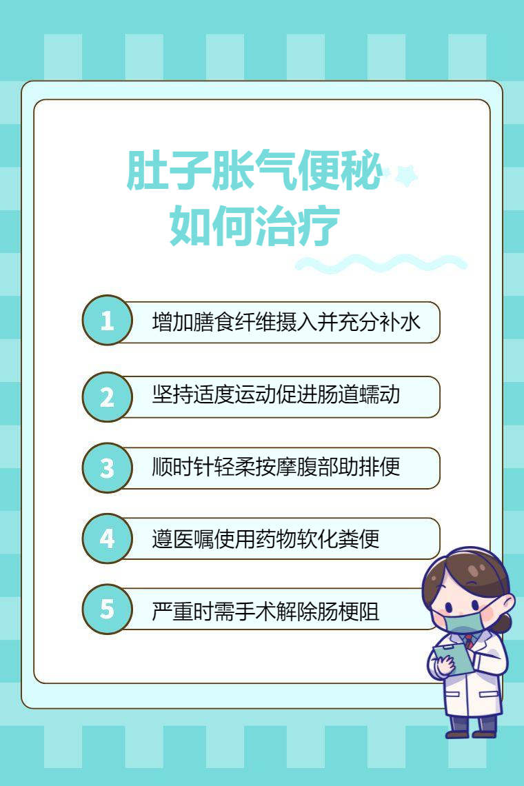 肚子胀气便秘可通过饮食调整、适当运动、腹部按摩、药物治疗、手术治疗等方法来缓解和治疗。