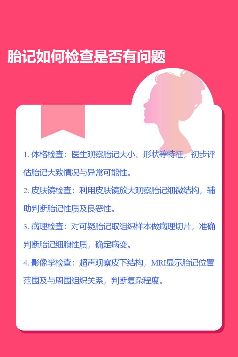 胎记检查是否有问题可通过体格检查、皮肤镜检查、病理检查、影像学检查等。