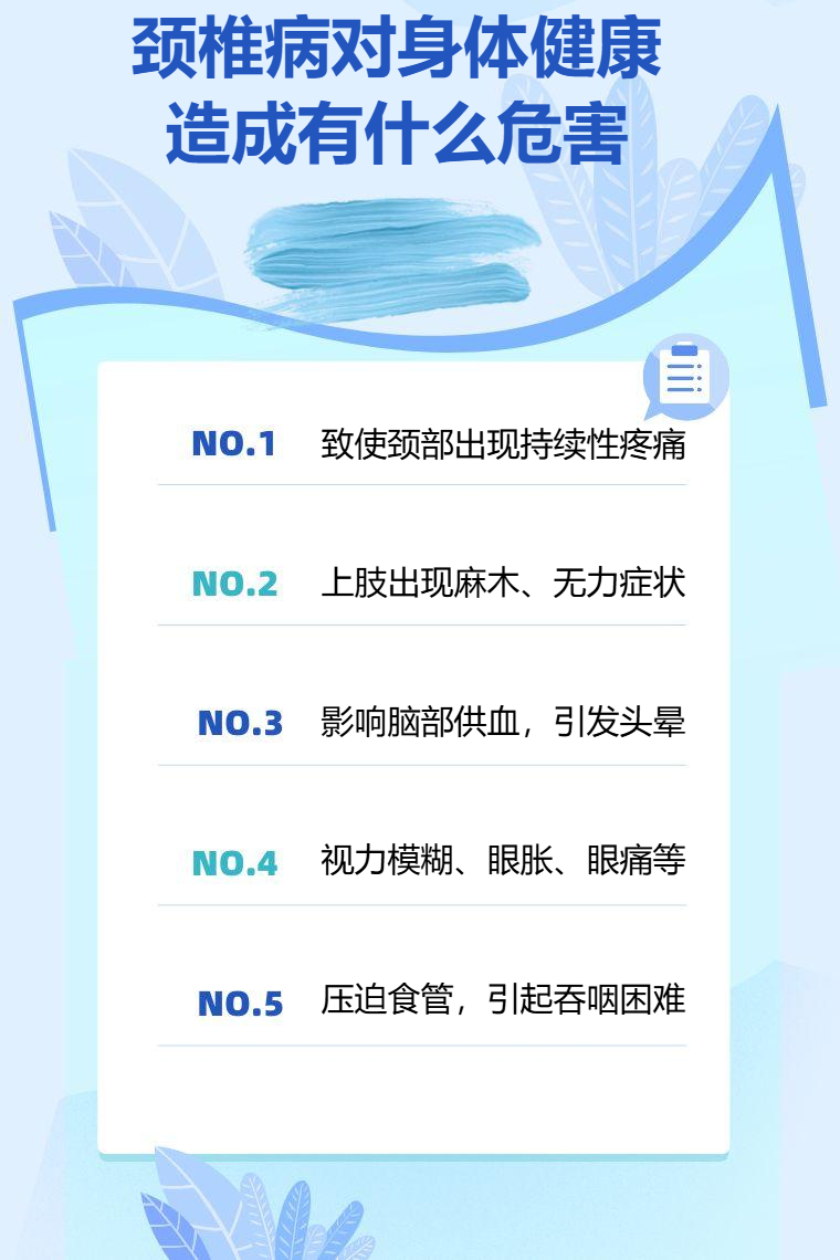 颈椎病对身体健康造成的危害包括颈部疼痛、上肢麻木、头晕、视力模糊、吞咽困难等。