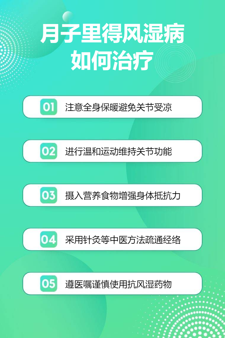 月子里得风湿病可通过保暖、适当运动、饮食调理、中医理疗、药物治疗等方法来应对。