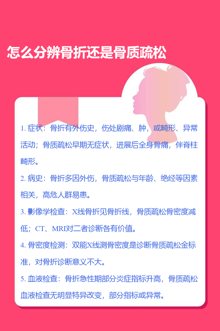 分辨骨折还是骨质疏松可从症状、病史、影像学检查、骨密度检测、血液检查等方面入手。