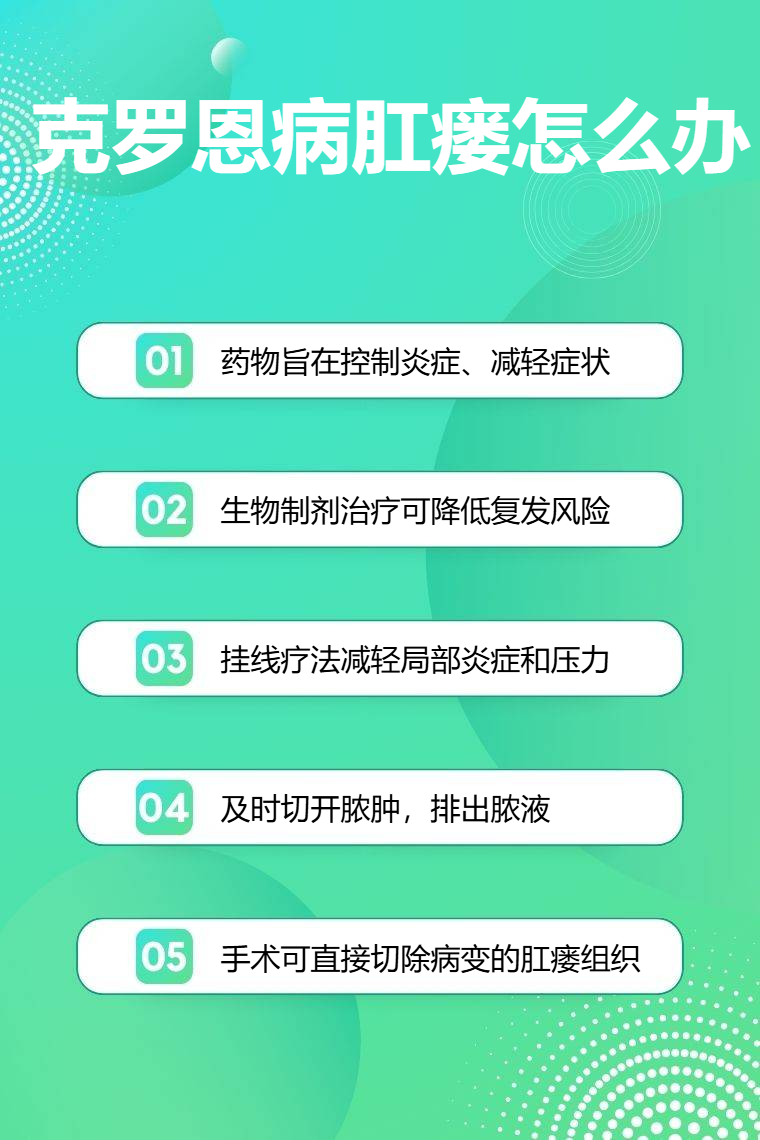 克罗恩病肛瘘的治疗方法有药物治疗、生物制剂治疗、挂线疗法、切开引流、手术治疗等。