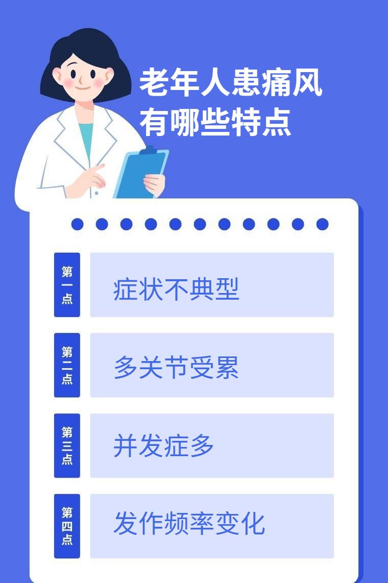 老年人患痛风的特点有症状不典型、多关节受累、并发症多、发作频率变化等。