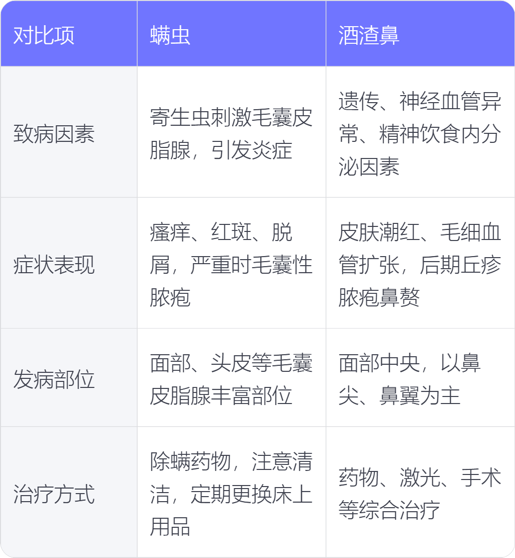 螨虫与酒渣鼻在致病因素、症状表现、发病部位、治疗方式上存在不同。