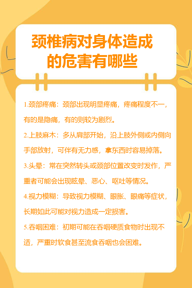 颈椎病对身体造成的危害有颈部疼痛、上肢麻木、头晕、视力模糊、吞咽困难等。