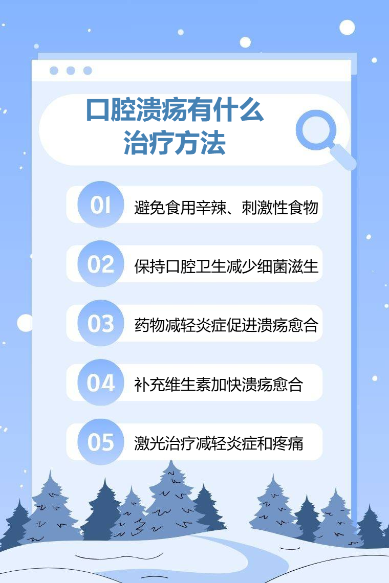 口腔溃疡的治疗方法有调整饮食、保持口腔卫生、使用药物、补充维生素、激光治疗等。